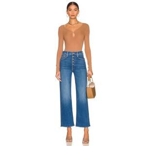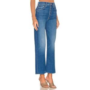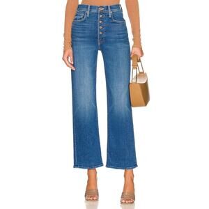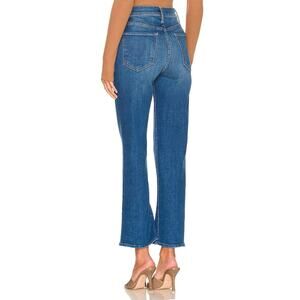 Featuring a high-rise waist, button fly, and straight-leg silhouette. High waisted. Five-pocket design. Corset-inspired waistband for a flattering fit. Crafted from soft stretch denim with a medium wash and subtle fading. Brand logo at back. Material: 94.5% Cotton, 4% Polyester, 1.5% Spandex. Made in the USA. Machine wash. Fits true to size