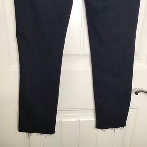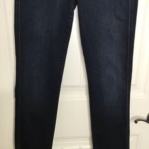 A straight skinner leg in a dark wash. These are in good used condition, but do have some light wear in the butt area, shown in the last photo.