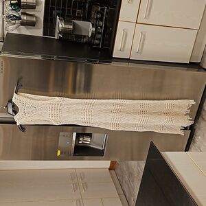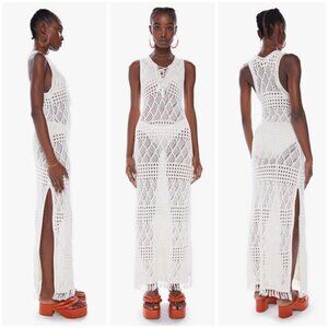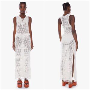 A sleeveless crewneck maxi dress with thigh-high side slits and a slim fit. Made from a cotton blend in white, the Skinny Dip dress is designed in a sheer crochet fabric with fringe at the hem.