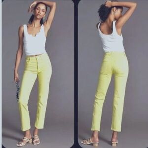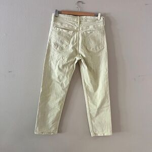 Classic denim cut, button-fly, light green color. Size 30 with approximate measurements laying flat of 15" waist, 11" rise, and 26" inseam. In excellent, gently used condition with a minor over-dye spot on back of one leg (see photo). From a smoke-free, dog friendly home.