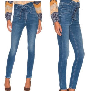 “Folded over a tie-waist, the L.A. denim label cuts their The Triple Stack Looker jeans for a skinny fit in their Wish On A Star wash. Waist sash tie belt. Zip fly and button closures. Four pocket styling.”