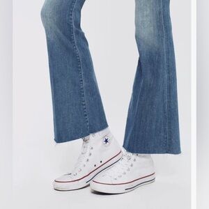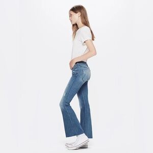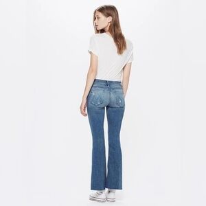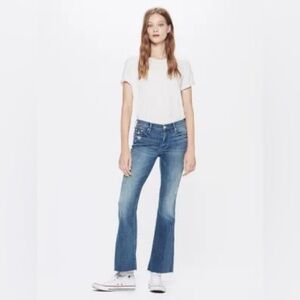 Mother Jean in The Weekender Graffiti Girl. The vintage inspired distressing makes for an effortlessly sexy look. The Weekender is a classic flare jean with a medium blue wash. Fading along the front and back pockets. Easy to just toss on with a white tee, pair of sneakers and your favorite hat for a casual day look.