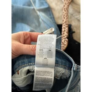90% cotton, 6% poly, 4% elastane. 12" at the knee narrows to 10" at the leg opening. Slight whiskering along the front pockets. Intentionally distressed areas. Intentionally frayed leg openings. Revolve Style No. MOTH-WJ396. Manufacturer Style No. 1121F 194.