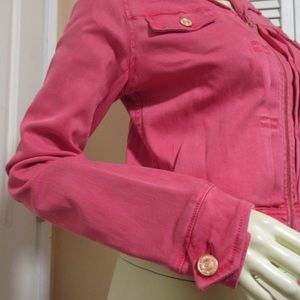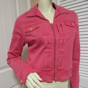 MOTHER Y2K womens denim jacket or jean jacket (trucker jacket) with full zip, collared, long sleeve in pink-red color - ladies jackets or fall/winter jackets great to wear as fall tops/outerwear. 100% Authentic. Two (2) chest pockets with flap and gold metallic button closure. Has zip up closure at front with gold tone zipper that opens all the way. Pleats details parallel to the zipper closure. MADE in USA. Material is 70% Lyocell 28% Cotton 2% Elasthane.