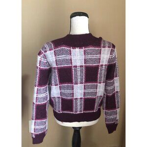A cropped V-neck cardigan with thick ribbed hems and buttons down the front. Knit from a blend of baby alpaca and wool, Bad Boy Magnet is a burgundy plaid with white details and oversized buttons. 60% Baby Alpaca 35% Polyamide 5% Merino Wool. Dry clean recommended. Excellent condition! No flaws or wear.