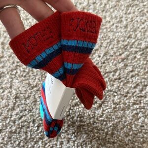 Bold red and blue stripes with a touch of green. Soft and stylish for any occasion. Wording along the toes “Mother Loves You.” Also wording around ankle Mother Fuc***