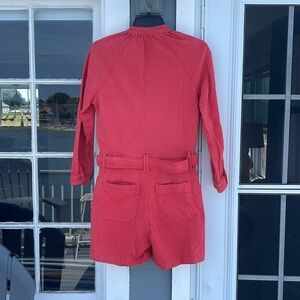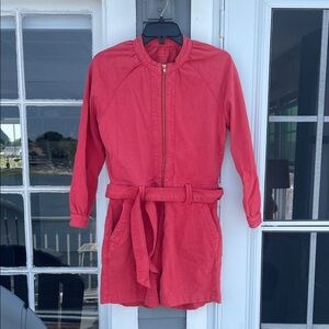 Bold red piece with a stylish design. Perfect for making a statement. Full zip center front, tie belt with two front pockets and two back pockets ***see the last picture of a flaw (small tear) by right back pocket - otherwise like new condition - size XS