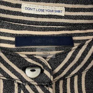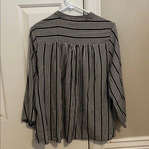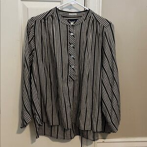 An airy blouse with a buttoned V-neck, oversized 3/4-length sleeves and a loose, boxy fit. Made from a cotton blend, Line In The Sun is a dark grey with a white stripe pattern and shell buttons. Pit to pit: 25 inches; length: 23 inches in front; 25 inches in the back. 70% cotton; 30% viscose. Excellent condition