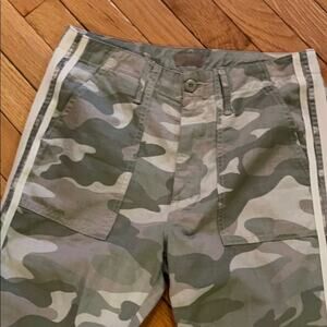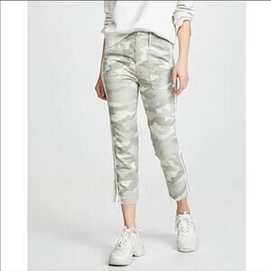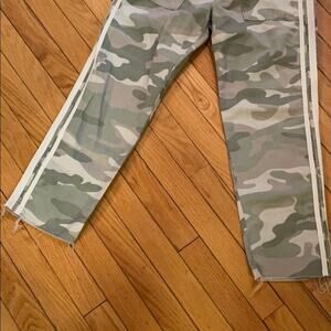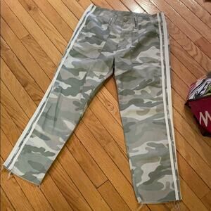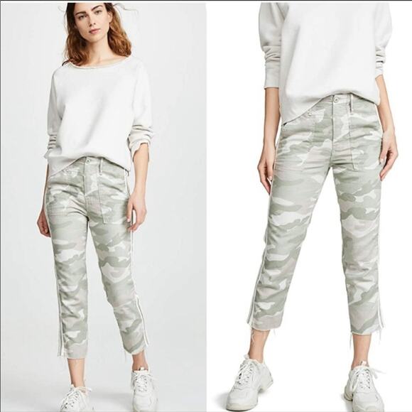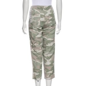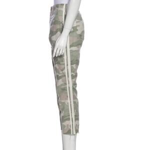 Green, camo Printed, Cropped with High-Rise, Raw-Edge Trim, Slit Pockets, Zip & Button Closure