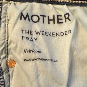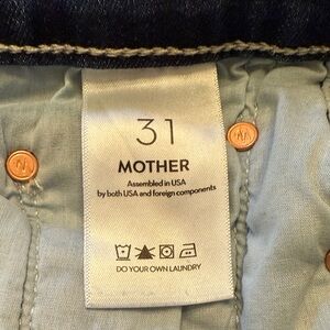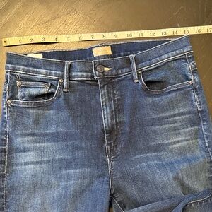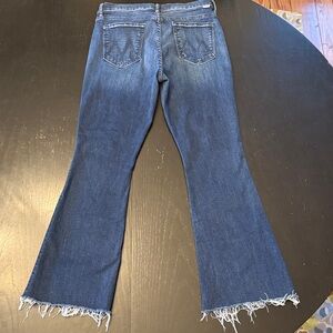 Mother dark blue jeans with a lightly flared leg. Features a stylish frayed hem. Size 31. Worn only a few times in excellent condition. Inseam 27 inches.