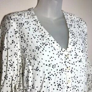 Size small. (S) women maternity clothes. Motherhood Maternity. White 3/4 sleeve tunic blouse shirt with black flower print. Almost like a lily Of The Valley flower print. V neckline. Missing string for waistband. Partial button down with cream buttons. Dress up or down. Daytime, work, casual, anytime. Fall winter spring summer