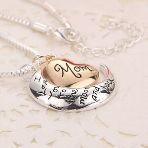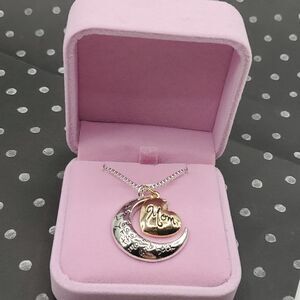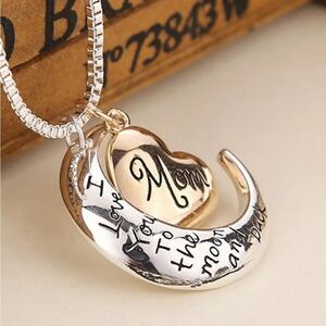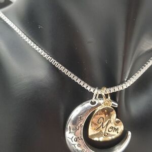 Beautiful and whimsical, this mother's necklace with silver cresent moon wording" I love you to the moon and back" and gold heart "mom". Chain is a box chain measuring 17" ( 20" with extender),