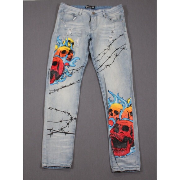 MOTIVE DENIM JEANS Blue Skull Graphic Rhinestone Print Stretch Tag 32X32 (32X31)