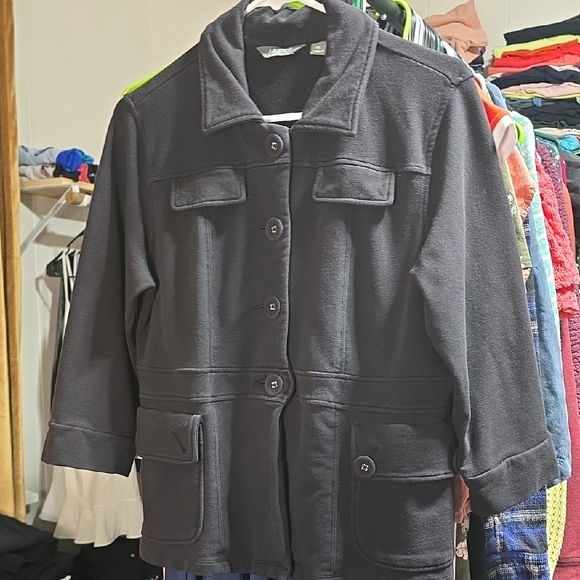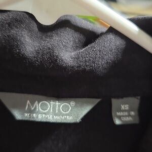 Classic MOTTO utility jacket in black. Button-front closure with five visible buttons. Two flap chest pockets and two lower patch pockets with button details. Point collar and long sleeves. Straight hem for easy layering.