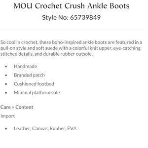 So cool in crochet, these boho-inspired ankle boots are featured in a pull-on style and soft suede with a colorful knit upper, eye-catching stitched details, and durable rubber outsole. * Handmade* Branded patch* Cushioned footbed* Minimal platform sole