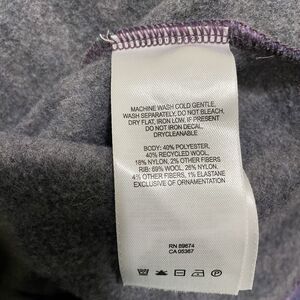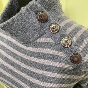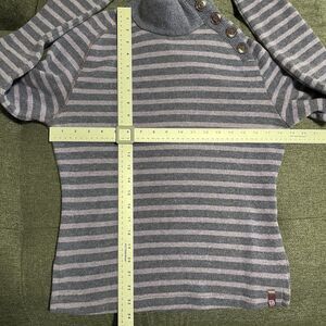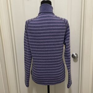 This is a women's Medium Mountain Hardwear turtleneck sweater made of wool blend fleece-lined fabric in a striped pattern with a high neck and button accents. It is a pullover style sweater perfect for winter, fall, or spring. The color is purple, and it features long sleeves with a tight-knit design. Ideal for various occasions like travel, outdoor activities, casual wear, work, or hiking, reflecting a nature and outdoor theme.