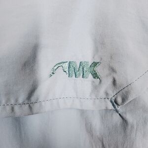 Button closure, zip and chest pocket, snap collar, vented/cape back.