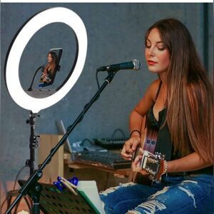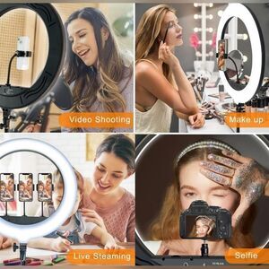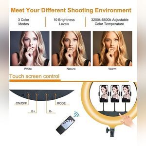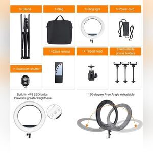 The MOUNTDOG 16" Ring Light Kit includes a 55W Bluetooth LED ringlight with a tripod for easy positioning. With a color temperature range of 3200k-5500K and 480 LED lights, this ring light provides even and bright illumination for photography and video projects. The LED light ring from Mount Dog is lightweight at 3.56kg and has dimensions of about 18 inches, making it a versatile and powerful lighting solution for various creative endeavors.