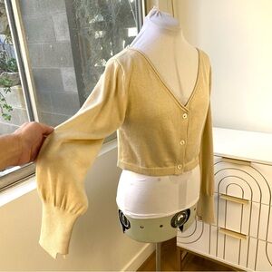 A refined MOUSSY VINTAGE knit in a luxe champagne tone—made in Japan with a silky, fine-gauge hand. Cropped V-neck silhouette, balloon sleeves with elongated rib cuffs, subtle delicate notch that highlights the wrists and luminous shell buttons down the front, each one unique. Drapes beautifully over tees, slips, and high-rise denim.