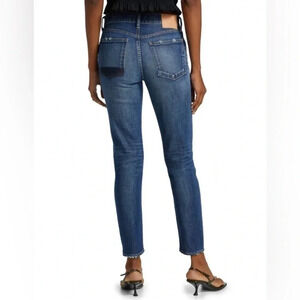 These mid-rise skinny jeans feature an ankle-cropped length and subtle distressing throughout. One back pocket features two-tone coloration for dramatic effect.