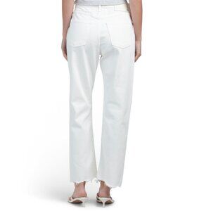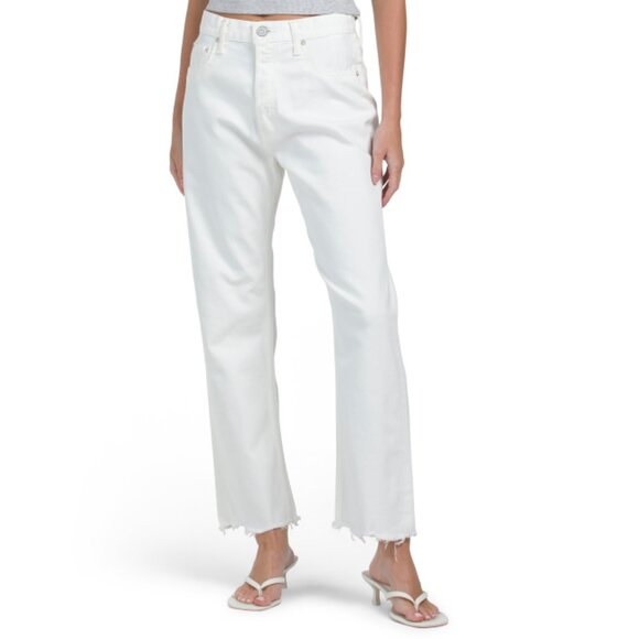 Brand New Color: White frayed hem, waist rise: 12in, fabric provides stretch cropped length, straight leg, 5 pocket style high rise waist button fly closure inseam: 27in, taken from size 26 cotton/spandex imported, made in Japan machine wash