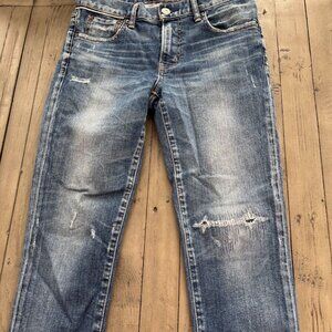 Made in Japan. Machine wash. Zip fly with button closure. 5-pocket styling. Light whiskering and intentionally distressed areas. Structured denim fabric. 14" at the knee narrows to 10" at the leg opening. Revolve Style No. MOUR-WJ188. Manufacturer Style No. 540GSC12-1031.