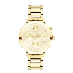 Three gold-tone chronograph subdials join the iconic silver sunray dot in this elegant BOLD Evolution women's watch from Movado. The gold mother-of-pearl dial includes a date display at 4 o'clock, a minute track surrounded by a gold-tone stainless steel bezel, and is set within a 38mm gold-tone PVD stainless steel case. The watch has a Swiss quartz chronograph movement, a K1 crystal, and water-resistance to 30 meters. The gold-tone PVD stainless steel bracelet secures with a push-button deployment clasp.