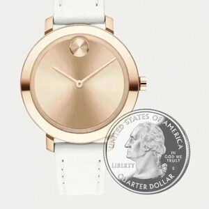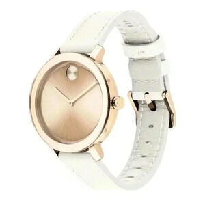 A white and rose-tone monochromatic design gives this women's Movado BOLD Evolution watch both edge and style. The watch features a thin 34mm gold-tone ion-plated stainless steel case, K1 crystal, and silver sunray dial and hands with gold-tone sunray dot at 12 o'clock. The white leather strap secures with a buckle clasp and the watch is water-resistant to 30 meters.