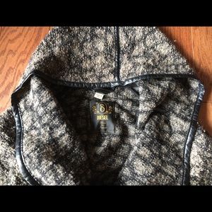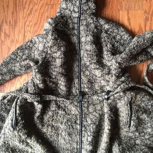 This cozy Diesel jacket is perfect for fall! The multi color jacket of browns and purples had a faux leather piping and a tie around the waist. The tie is a little stretched out so its long. Size small but can be tied as loose or tight as you like!