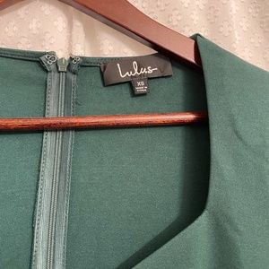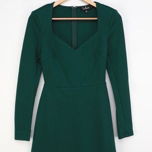 Only worn once for professional photos. Lulus Exclusive! We've got our sights set on the Lulus Desires of the Heart Emerald Green Long Sleeve Skater Dress! This gorgeous ponte knit mini dress boasts a sweetheart neckline and a fitted, darted bodice. Long sleeves have padded shoulders for extra drama. High, fitted waist sits above the flared mini skirt. Hidden back zipper/clasp.