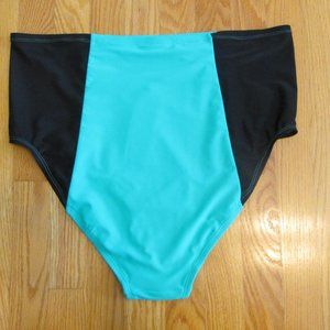 MOXI BLU WOMEN'S SIZE 4X (26-28W) SWIM SUIT BRIEFS BLACK & TEAL TANKINI HIGH WAIST BOTTOM NWT. Fabric: 82% Nylon, 18% Spandex; Side panels: 83% Nylon, 17% Spandex; Lining: 100% Polyester. Color on tag is Teal Ordeal. Teal front and back inset with black sides for a slimming appearance. Swim wear brief with elastic in the top & at the leg openings. Teal top stitching. Front & back inserts are lined. Pair with a black top to add some color to your swim wear.
