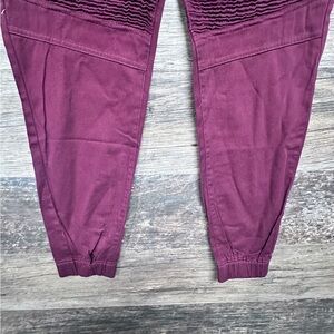 These cargo pants feature a deep purple color and are designed for comfort with a soft material. The tapered leg and elastic cuffs provide a modern jogger style, while the elastic waistband ensures a secure fit.