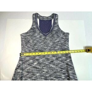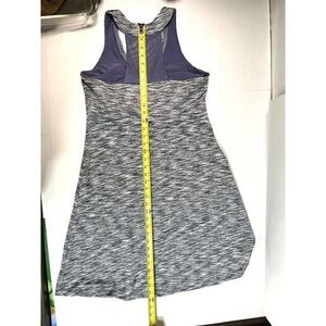 MPG Women's Athletic Racerback Dress Size Large Travel. Blue, White, and Black with a purple sheer accent on back and trip of V neck. Shelf Bra with removable pads. Pockets on the sides. Measurements in photos. Very good pre-owned condition. No rips, holes, or stains. Comes from smoke free environment.