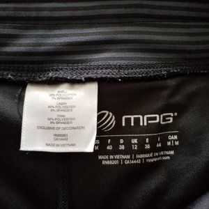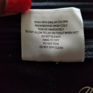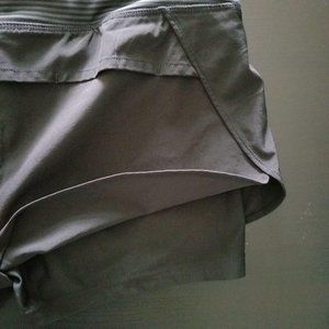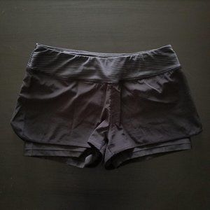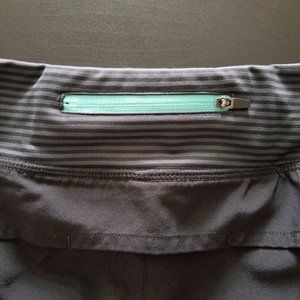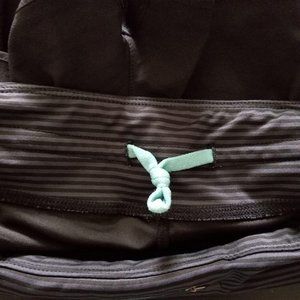 Black athletic shorts. Black & Gray striped elastic banded drawstring waist. Small zipper back pocket. Turquoise accents on drawstring & zipper pocket. Inner shorts.