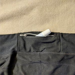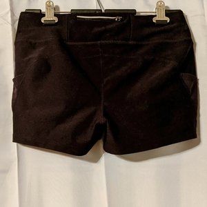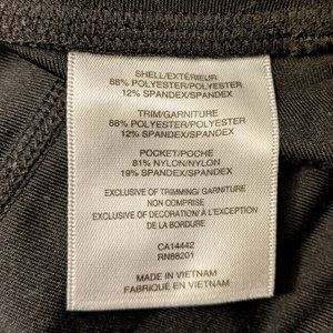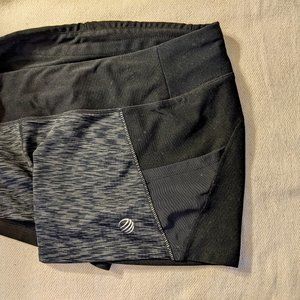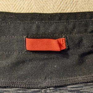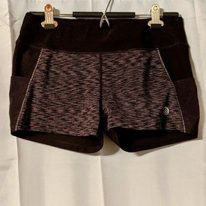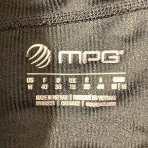 These bike/gym shorts from MPG are flattering and functional with a sculpted fit and 3 pockets. They're relatively short (3-inch inseam) and have a tall waistband (2.5 inches high) that sucks in the belly. 88% Polyester, 12% Spandex. Triangle-shaped open mesh pockets on right and left sides. Zip pocket in middle of back waistband fits ID/credit cards. Reflective trim on parts of front and back. Orange elastic pull inside waist can adjust fit. Logo on left leg. In very good condition; no flaws.