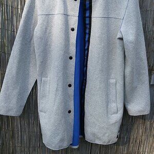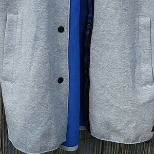 Preowned. Gently used. Snap closure. Both sides of jacket have 2 snaps - see photo. This sweatshirt / jacket does not have a hood.