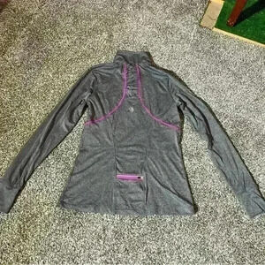 The jacket is a solid gray color and has a mid-length coat design with long sleeves. It is a size S, with an athletic fit that is great for any performance or activity. The jacket also has a 1/4 zip for added convenience. It is perfect for gym and training, walking, golf, dance, CrossFit, yoga, athleisure, pilates, fishing, hiking, cheerleading, or any sports related activity. This jacket is a must-have for any woman who wants to stay comfortable and stylish while doing any physical activity.