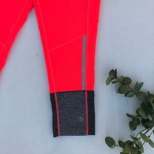 MPG training crop / capris leggings in a color block design in diva pink and gray. Pink is a neon pink that looks almost orange. Brand new with tags. There are some small marks on a leg that happened in storage but can be cleaned.
