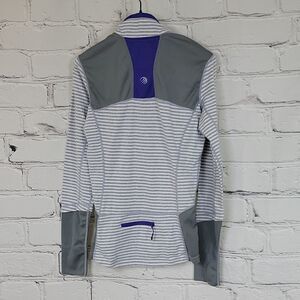 Great pre-owned condition top, no flaws. Super cute gray & white striped top with purple accents. Thumbholes. Zip key pocket back waist.