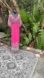 that’s pretty caftan has a border print design. It is a Barbie pink, gray, and white kind of a paisley. This is a sheer poly woven fabric, but the body of the calf tint is lined and in excellent condition marked a one-size-fits-all. I think we’ll do best witha medium or large and will fit up to an extra large.