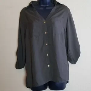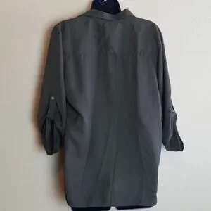 This is a dark army green button down shirt by MPH Collection. It features long sleeves that have a button cuff which makes them around 3/4 length. The buttons are a bright gold color.