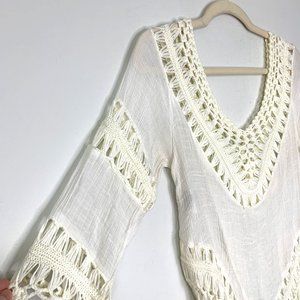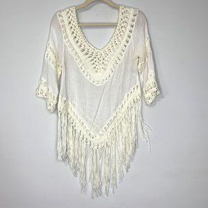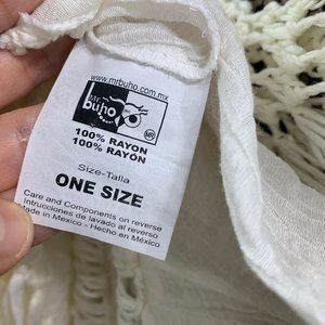 MR. BUHO Vintage Rayon Crinkle Gauze Crochet Fringe Scarf Boho Top features cut outs. OS