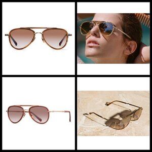 The frame's design was inspired by the 80s Los Angeles pool scene & the work of fashion photographer Helmut Newton. Its classic aviator shape draws inspiration from the period, & custom layered gradient mirror lenses and precious metal plating reflect the street’s luxury setting.
