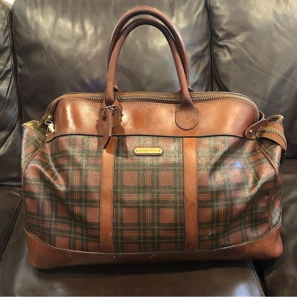 RALPH LAUREN Brown Green Tartan Plaid Top Handle Boston Duffle Travel Bag