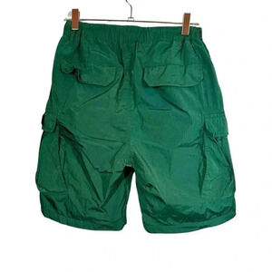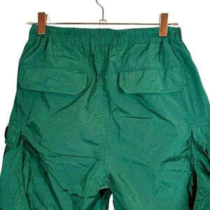 These cargo shorts are made of a thick nylon parachute type material with a subtle sheen and crinkled texture.