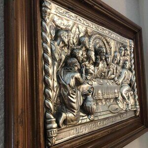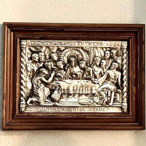 A Gorgeous 100+ year old Antique Framed 3-D Silver Metal Sculpted Relief Art Plaque depicting Jesus and His Disciples at the Last Supper