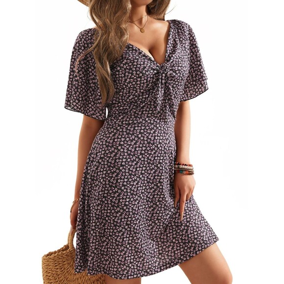 MSBASIC SUN DRESSES FOR WOMEN 2024 RUFFLE SLEEVES SEXY V NECK WOMENS SUMMER DRESSES(FLORAL-4,SMALL)
