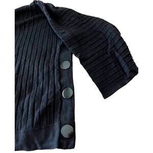 The 3 large Black buttons on left side starting at waist area makes this sweater/top unique - perfect for work, party, out-to-dinner during those cooler months; ribbed fabric; 3/4 Dolman sleeves; crewneck; banded all along bottom of sweater top; lots of stretch for a more comfortable fit