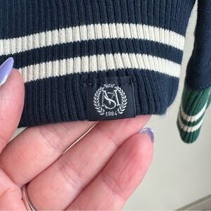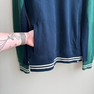 This classic M&S men’s pullover sweatshirt features a bold two-tone green and navy block design with sporty striped cuffs and hem. Made from soft, midweight cotton-blend fleece, it includes a quarter-zip neckline, kangaroo pocket, and ribbed detailing for comfort and durability. Perfect for layering in cooler weather or casual weekends.