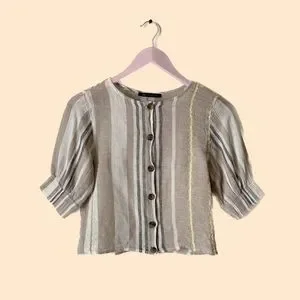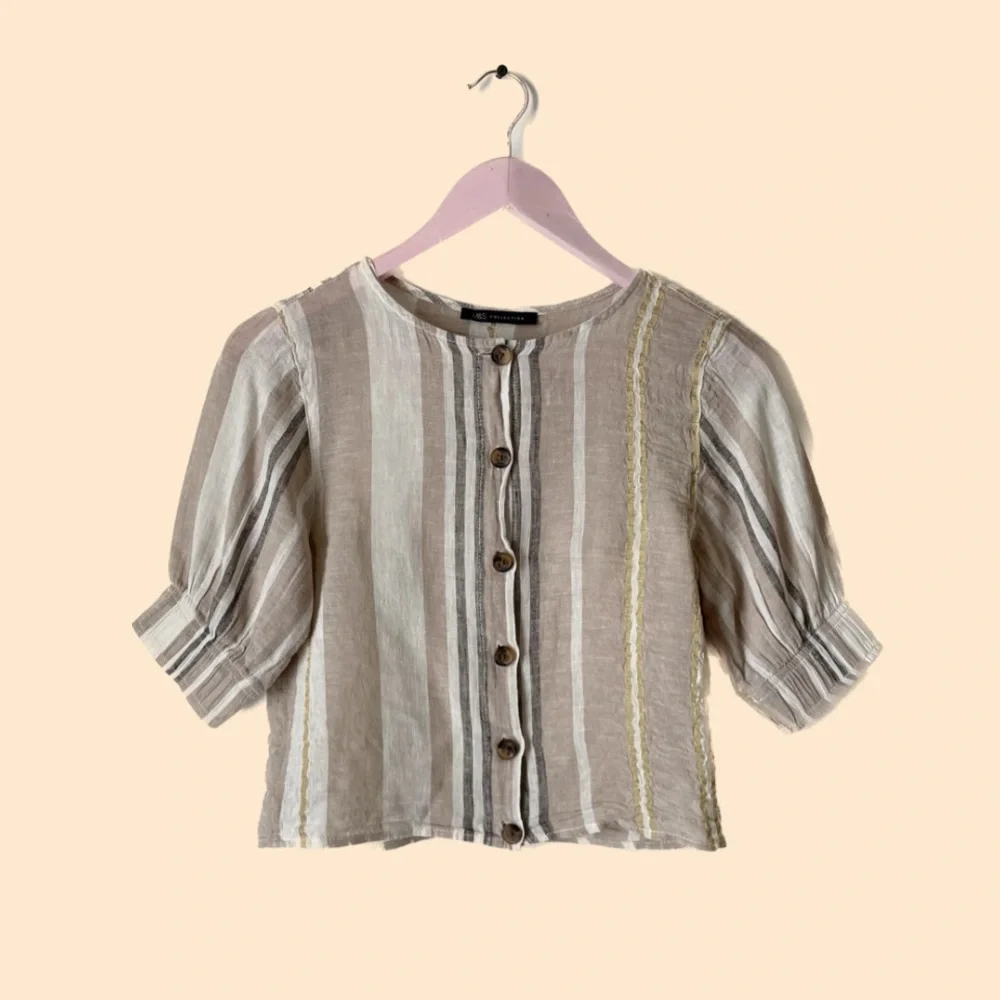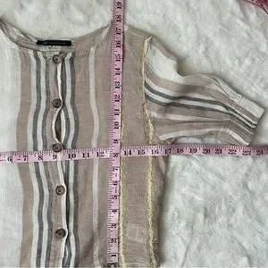 Vertical striped neutral color short sleeve button down blouse by M&S. Excellent preowned condition. Cotton/linen/metallic blend. Size 2.